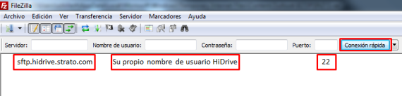 Para que te puedas conectar a tu servidor de HiDrive, necesitarás la siguiente información de conexión: