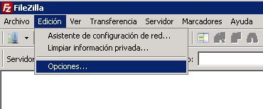 Para poder utilizar la clave SSH también en FileZilla, es necesario acceder a la configuración de FileZilla. Accede a las Opciones en Filezilla.