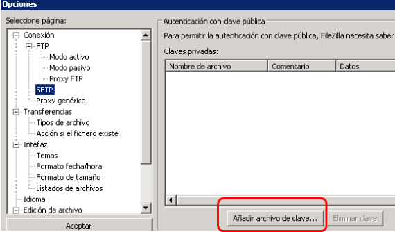 La clave privada creada se cargará en la configuración a través del punto "SFTP" -> "Añadir archivo de clave" > Selección de la claves privadas, selecciona y haz clic en Abrir.