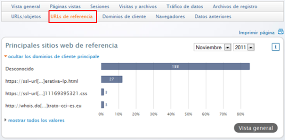 Las URLs de referencia son páginas web, mediante las cuales se ha llegado a tu sitio web. Pulsando en mostrar todos los valores puedes visualizar todas las URLs.