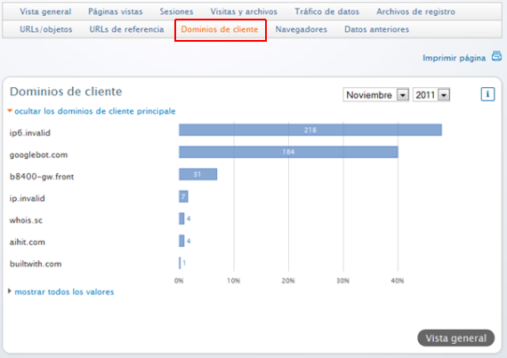 Dominios de clientes son los dominios desde los cuales se ha accedido a tu página web. Pulsando en mostrar todos los valores puedes visualizar los dominios de todos los clientes.