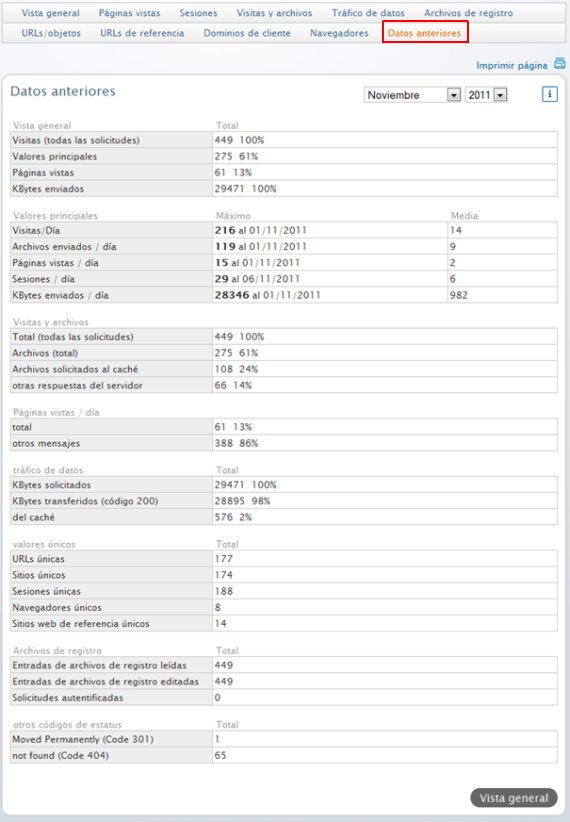 En datos anteriores encontrarád un resumen de las informaciones estadísticas más importantes de tu sitio web.