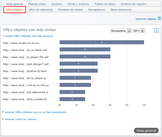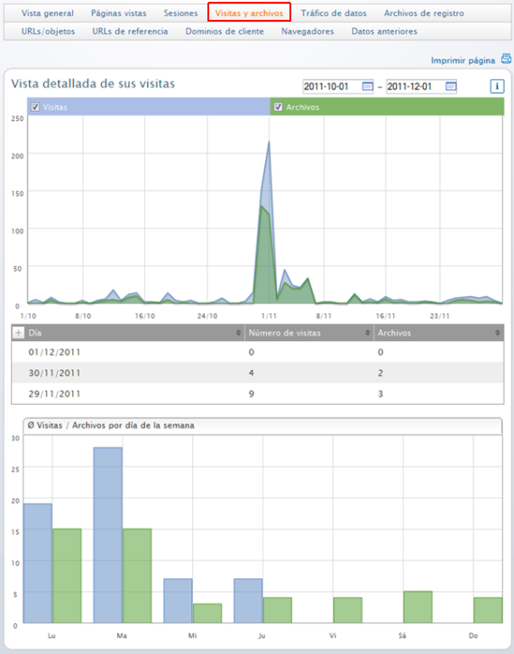 Archivos son elementos de tu página web, por ejemplo imágenes o archivos de texto. Mediante el calendario mostrado arriba a la derecha puedes seleccionar un periodo y mostrar las estadísticas para dicho periodo.