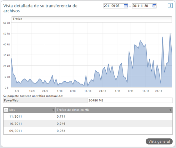 El tráfico de datos indica cuántos Kbytes se han transferido desde tu página. Mediante el calendario mostrado arriba a la derecha puedes seleccionar un periodo y mostrar las estadísticas para dicho periodo.