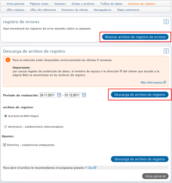 Los archivos de registro recogen los accesos a tu sitio web directamente desde el servidor web. Puedes visualizar los archivos de registro directamente online o descargarlos a tu ordenador. Elige aquí el periodo deseado (como máximo 6 semanas de anterioridad) y haz clic en descarga de archivo de registro.