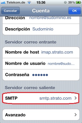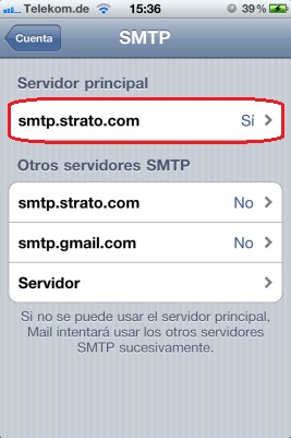 Pulsa ahora en la opción del servidor de correo saliente (SMTP - smtp.strato.de) y a continuación otra vez arriba en el servidor principal sobre el apartado smtp.strato.de.