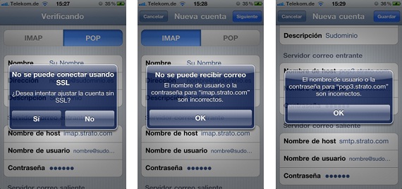 Ahora se comprobarán todos los datos del servidor de correo indicados anteriormente. Asegúrate de que tu iPhone/iPod tiene actualmente una conexión a internet activa. En caso de que los datos indicados no sean correctos, se te informará con una de las siguiente pantallas de error, para que puedas corregir los datos correspondientes.