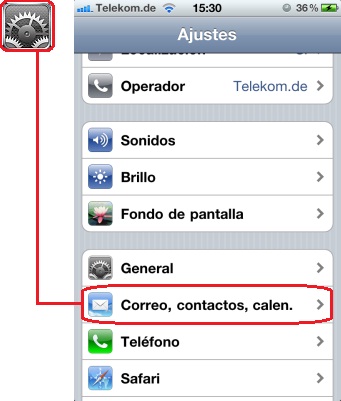Si ya tienes configurada una cuenta de correo electrónico en tu Apple iPhone/iPod Touch y quieres modificarla, pulsa en el icono de Ajustes y selecciona en el menú la opción Correo, contactos, calen.