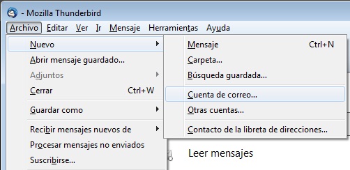 Abre Mozilla Thunderbird, si es la primera vez que inicias el programa se abrirá automáticamente el asistente de configuración de una nueva cuenta de correo. Si ya has utilizado previamente el programa podrás abrir el asistente desde el menú Archivo --> Nuevo --> Cuenta de correo.