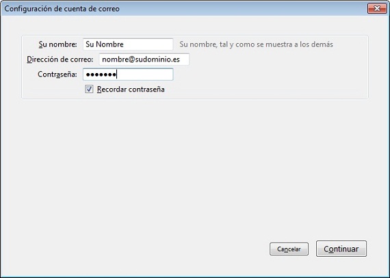En la primera pantalla del asistente de configuración deberás indicar tu nombre, que será utilizado como remitente y se mostrará a los destinatarios de tus mensajes, tu dirección de correo y la contraseña del buzón de correo electrónico. Pulsa en continuar y Thunderbird buscará los ajustes del servidor para tu dirección de correo.