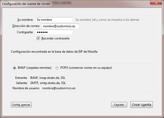 Si Thunderbird puede encontrar la configuración correcta para los servidores de correo entrante y saliente se mostrará la siguiente imagen. Elige aquí qué tipo de configuración para el servidor de correo entrante quieres utilizar, POP3 o IMAP y pulsa en Crear cuenta. En caso de que Thunderbird no sea capaz de encontrar la configuración sigue leyendo aquí