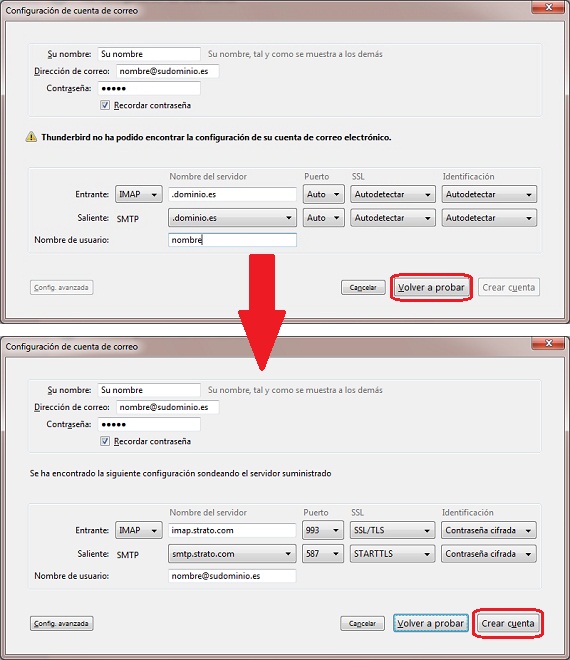 En el resto de opciones deja seleccionado Auto y Autodetectar y pulsa en el botón Volver a probar; el sistema rellenerá de manera automática todos los campos. Pulsa finalmente en Crear cuenta para finalizar la configuración.