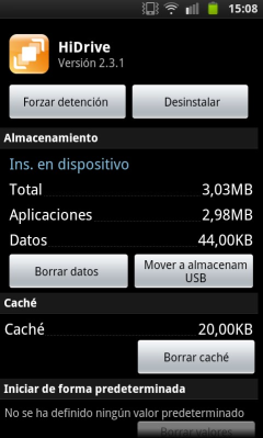 Puede liberar su memoria interna guardando la app de HiDrive en la tarjeta SD. Para ello, pulse en el icono Ajustes. A continuación, abra el punto del menú Aplicaciones y elija el punto Administrar aplicaciones. Si pulsa la opción Mover a almacenamiento USB el espacio interno se liberará.