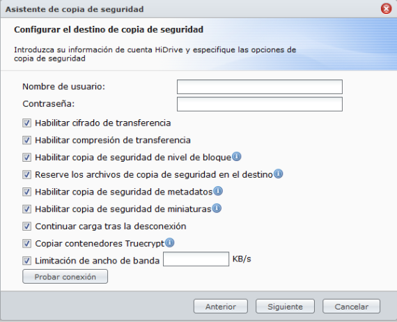 Indica un nombre para tu copia de seguridad e introduce los datos de acceso de tu cuenta de HiDrive. Te recomendamos activar todas las opciones que aparecen y limitar el ancho de banda de la carga para poder seguir utilizando otros servicios de Internet en paralelo.