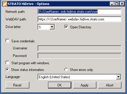 Cuando abra el software por primera vez, tendrá que indicar en los dos campos los datos de su cuenta de usuario de HiDrive. La ruta de red está indicada por defecto, solo tendrá que completar el nombre de su cuenta de usuario para el protocolo que desee. Es usted el que define los datos de usuario y contraseña en su panel de usuario de HiDrive.