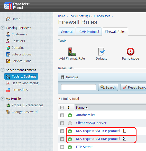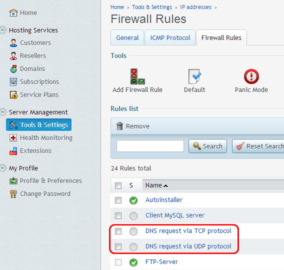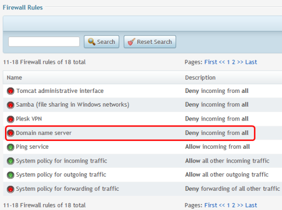 A continuación, entre las reglas de Firewall, elige las dos entradas DNS y quita la selección en Activar regla.