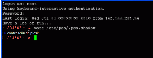 Para acceder a la contraseña de Parallels Plesk Panel, es necesario iniciar sesión en la consola a través de SSH con el usuario root.